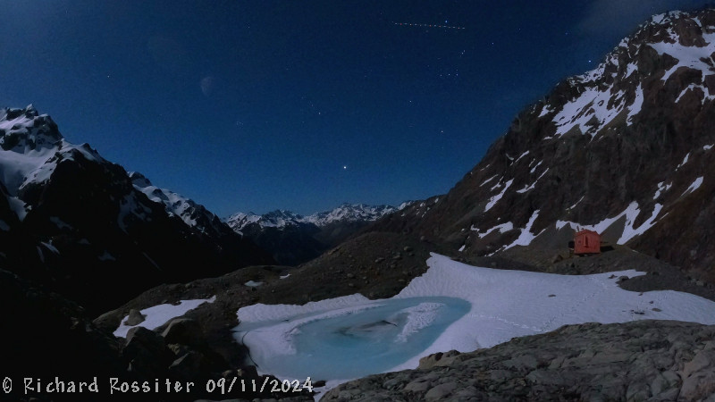 Night photo from a 9hr nightlapse from Barker Hut under moonlight with Starlink flying past in top of photo