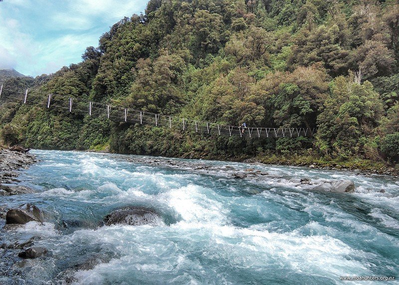 From the hut, cross Hura Creek and continue along the river flats, and a section of bush travel to the crossing of Dunns Creek. From here continue boulder-hopping beside the river or on remnant track for about 2.5km, at which point you will encounter a landslide, and the river canyons below. Looked for a taped or marked route up this slip - this slip is active and the route up it keeps changing. At the top of the slip the route sidles onto a terrace for about 700m before a descent to the Scotties three wire bridge (the Taipo River is rarely crossable, but if it is you can ford it to the true-right above the canyon, cross Hunts Creek, and continue on to join the track to Dillon hut).
