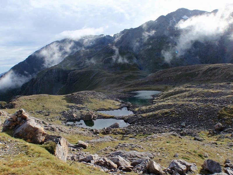 Harman Pass is a junction point for trampers taking the marked route down Mary Creek to Julia Hut. Be sure you take the marked route to Ariels Tarns; there are no signs!