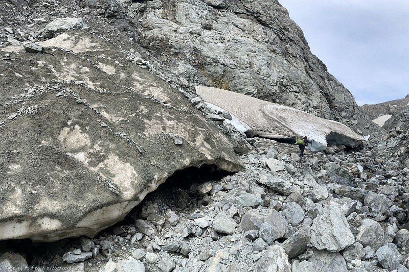 From Harman Pass, a poled route ascends to the first of Ariels Tarns by sidling on the tussock and rocky shelves well above the small gorge of Mary Creek. Pass the tarns and continue to follow the poled route past a small rock hump and onto piles of rock before reaching the Whitehorn icefield. In recent years the icefield has been melting away completely by mid-February. This can expose considerable amounts of loose rock, and large unstable boulders – extreme care is required negotiating this section and can be very slow going. If the icefield is present, it may have crevasses, and moulins (deep water sinkholes); ice-axes and crampons are recommended. Avoid walking on the first 100 metres of ice by using the rocky edges to bypass the weak and shallow ice above the creek.