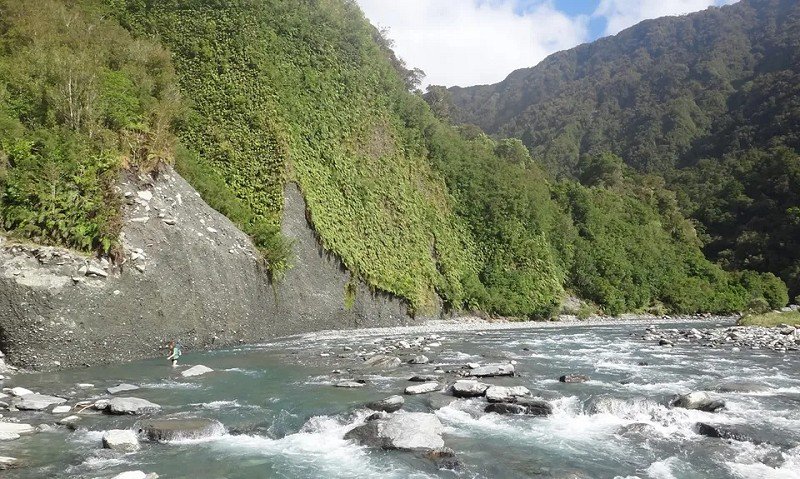 Once you cross the river, sidle along the track. There are three avalanche chutes to cross, so take care in winter to early summer. The track ends at a side creek with steep gravel banks, close to the Arahura. Drop to the riverbed. Travel down the river on whichever side is easiest (generally the true left).