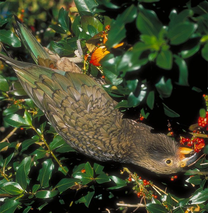 The total population of Kea has been estimated at about 5000. They live usually in alpine and bush-line country, feeding on a wide variety of berries, shoots and insect larvae. They are opportunistic feeders with a particular liking for fatty foods, hence their interest in public rubbish dumps and discarded food at skifields.