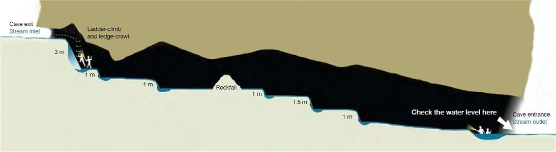 - Water levels in the cave can vary considerably, irrespective of the flow rate. Heavy flooding can scour gravel out of the base of the water channel and waterfall plunge pools, making them very deep and creating issues reaching handholds etc - DON'T EXPECT THE CAVE TO BE THE SAME AS THE PREVIOUS TIME YOU VISITED!