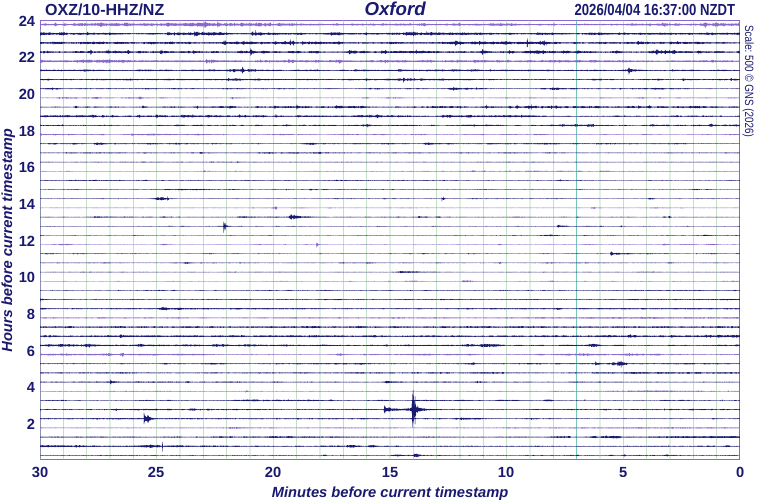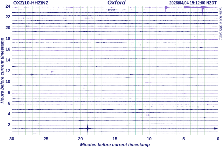 Magnitude 1.1, Sun, Mar 22 2026 at 12:54:25 am (NZST), 35 km north of OxfordThe timestamp shown at the top right of the seismograph drum shown below is the time when this image was last refreshed. Each horizontal line (or trace) represents 30 minutes, each vertical line is spaced 1 minute apart; 24 hours of recording are displayed in total. The most recent signal is drawn at the bottom right hand corner of the drum. Then read the traces from right to left, bottom to top, to get from the most recent to the oldest signals. The trace will appear red if the signals are very large; this means they have been clipped to stop them overwriting too much of the surrounding image. This image is updated every 10 minutes.