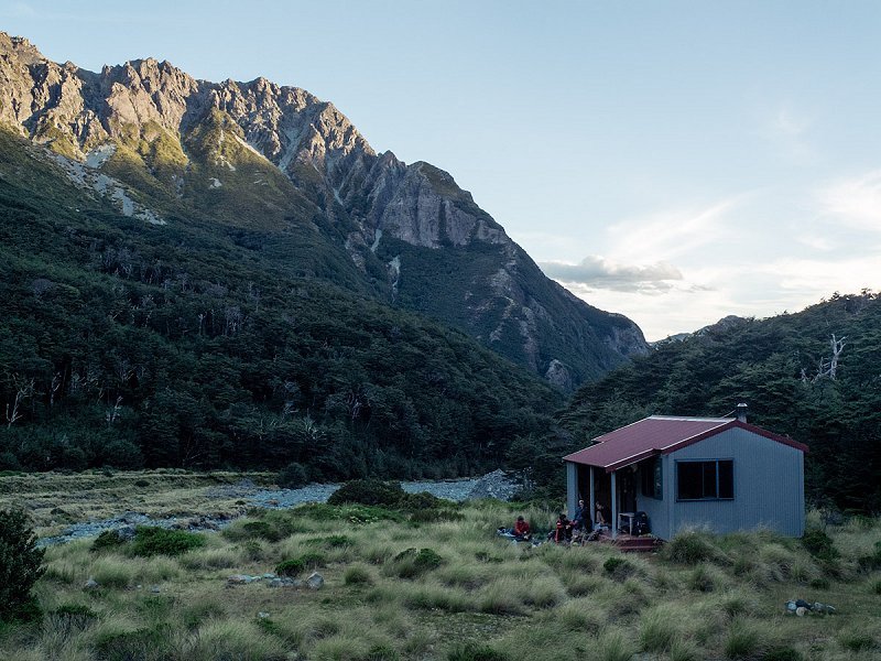 Follow the riverbed downstream for 20 minutes to the hut. If the river is high, look for a crossing as far above the hut as possible. The 10-bunk hut stands in a clearing on a terrace at the bush edge. The Crow face of Rolleston at the head of the valley is a popular winter climbing route.