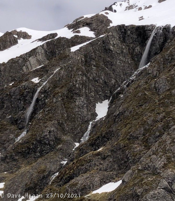 Numerous, and continuous wet snow avalanches commencing in solar affected snow-fields 1700m+, and pouring over cliffs through gullies. Some of these avalanches were quite large (Class 2+). Photograph only captures tail end of pour (rendered from video). These were natural releases, however climber triggered events of similar scale were easy to initiate on the Goldney Glacier, and Bealey Slide.