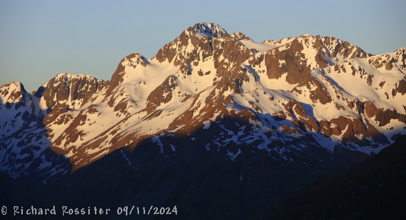 Last of the sun's rays strike the western slopes of Mt Rolleston with the High Peak, Middle Peak and upper part of the Crow Glacier visible