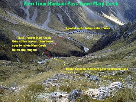 Three poled routes head away from Harman Pass, one into the Taipoiti, another towards Whitehorn Pass, and your route descending into Mary Creek. From Harman Pass head downhill and slightly to the right (northwest), looking for marker poles ahead of you leading down the tussock slope.