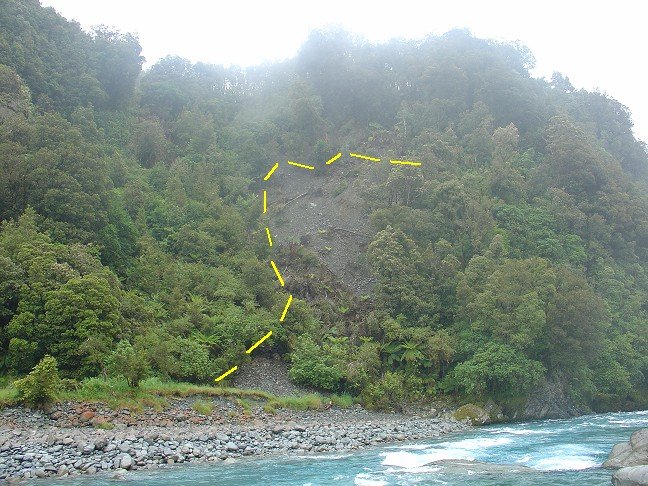 From the hut, cross Hura Creek and continue along the river flats, and a section of bush travel to the crossing of Dunns Creek. From here continue boulder-hopping beside the river or on remnant track for about 2.5km, at which point you will encounter a landslide, and the river canyons below. Looked for a taped or marked route up this slip - this slip is active and the route up it keeps changing. At the top of the slip the route sidles onto a terrace for about 700m before a descent to the Scotties three wire bridge (the Taipo River is rarely crossable, but if it is you can ford it to the true-right above the canyon, cross Hunts Creek, and continue on to join the track to Dillon hut).