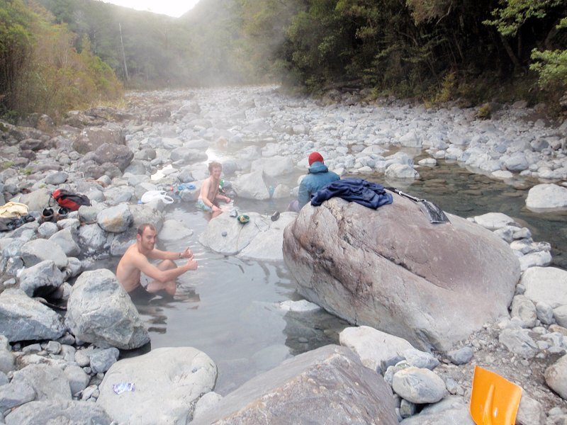 The "track" drops into Whaiti Stream about 200m from its confluence with the Otehake. This stream often rises rapidly to become impossible to cross. The track begins again slightly lower down (20m) on the other side; climbing a steep bank to enter thick bush. Another series of landslides (1.7km downstream of Whaiti Stream) require care. The track eventually descends back to the Otehake River about 200m upstream of an island. Cross the Otehake where safe to the true-right, and move into the dry flood channel there. This is where you will find the reward of the Otehake hot spring. Do not immerse your head in the