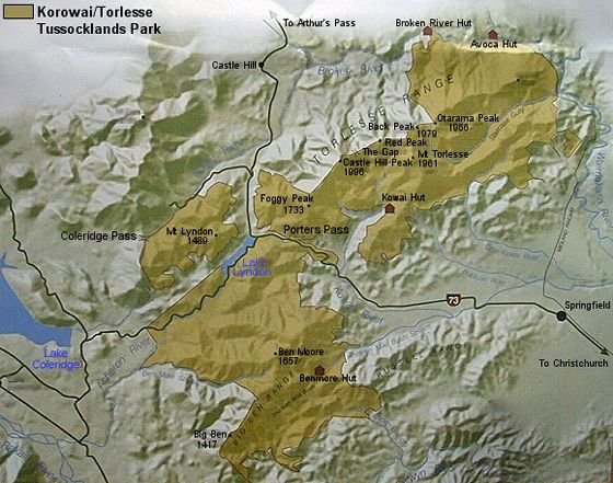 Korowai/Torlesse Tussocklands Park covers approximately 21,000 hectares on the Torlesse and Big Ben Ranges, in Canterbury's high country. The Torlesse and Big Ben Ranges are a visible feature on the landscape from as far away as Christchurch and the Port Hills. Travellers on state highway 73 between Christchurch and the West Coast gain an increasingly panoramic view of the park as they approach Porters Pass. The Torlesse Gap is an outstanding visual feature on the horizon. Korowai/Torlesse Tussocklands Park is a key site for the promotion and protection of eastern South Island high country landscapes and ecosystems.