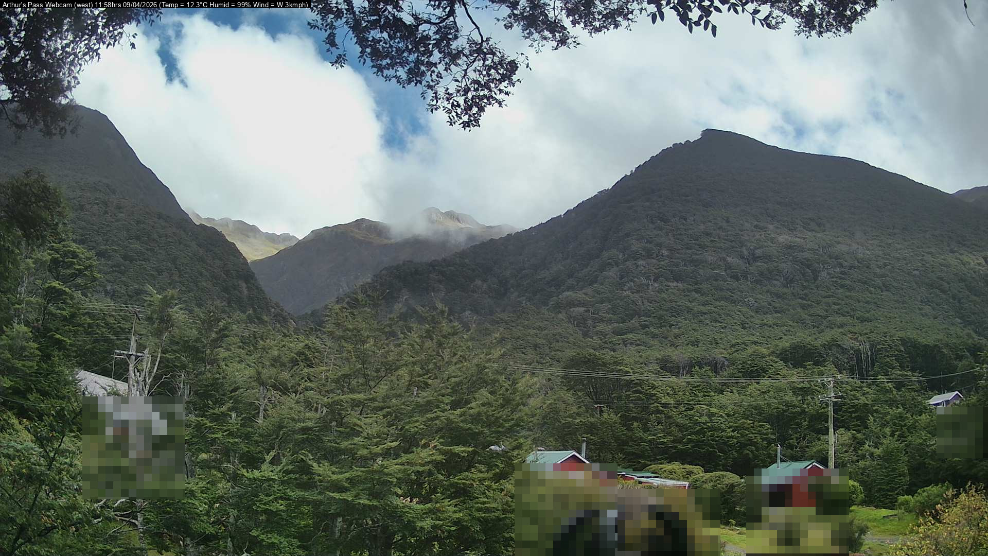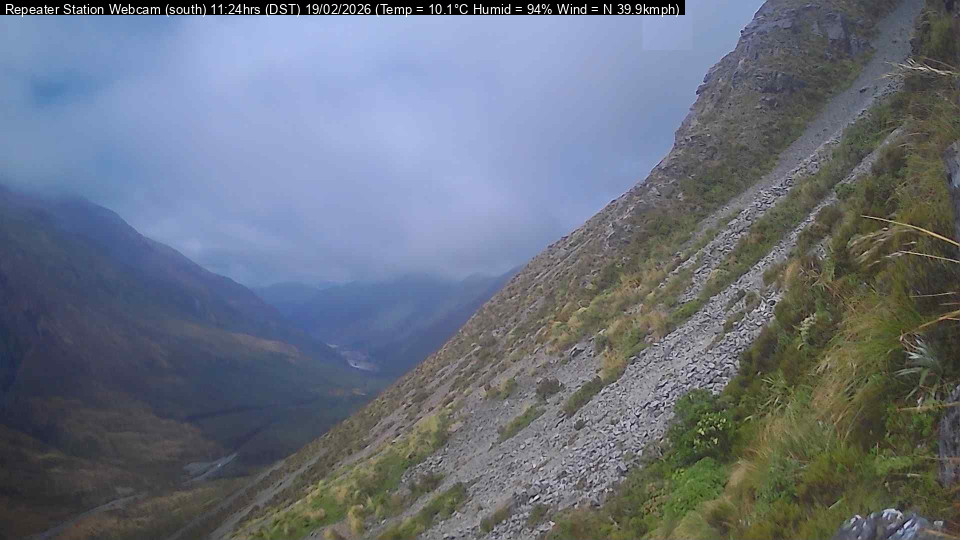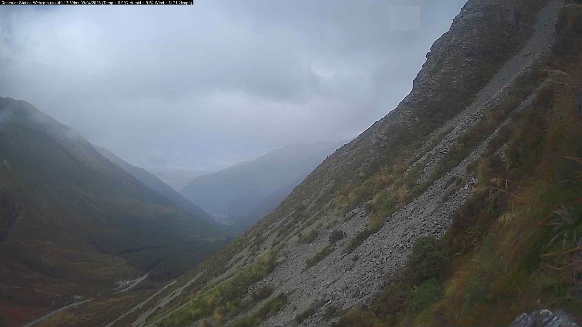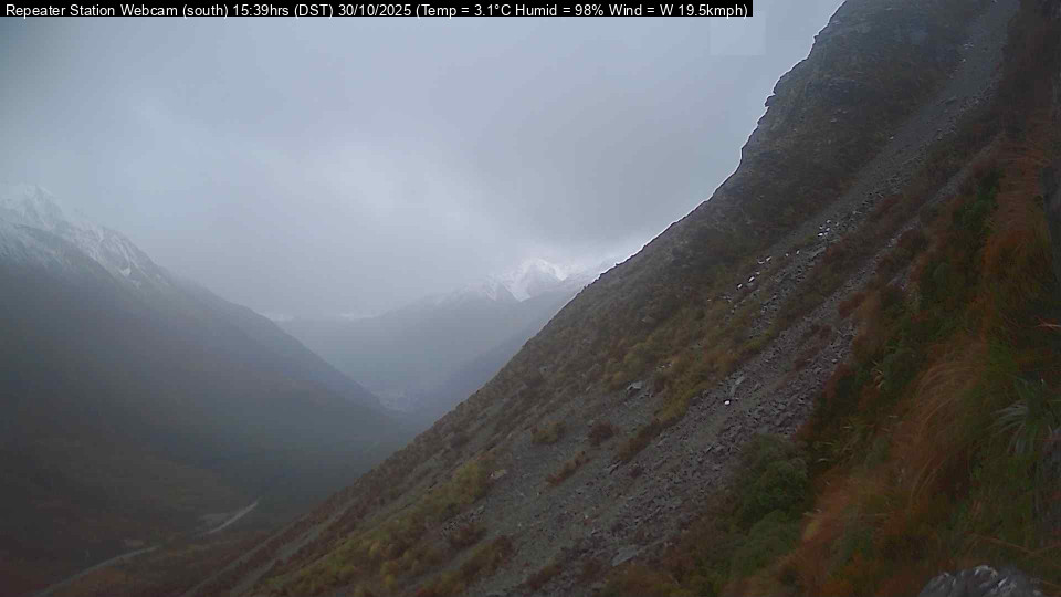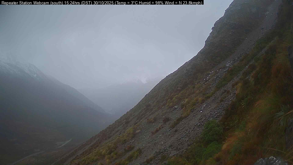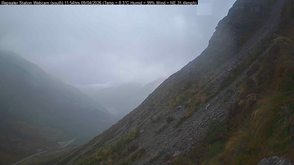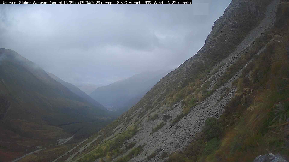 south from the Arthur's Pass Repeater Site towards Arthur's Pass Village with Mt Cassidy (left). The image is updated every 15 minutes.