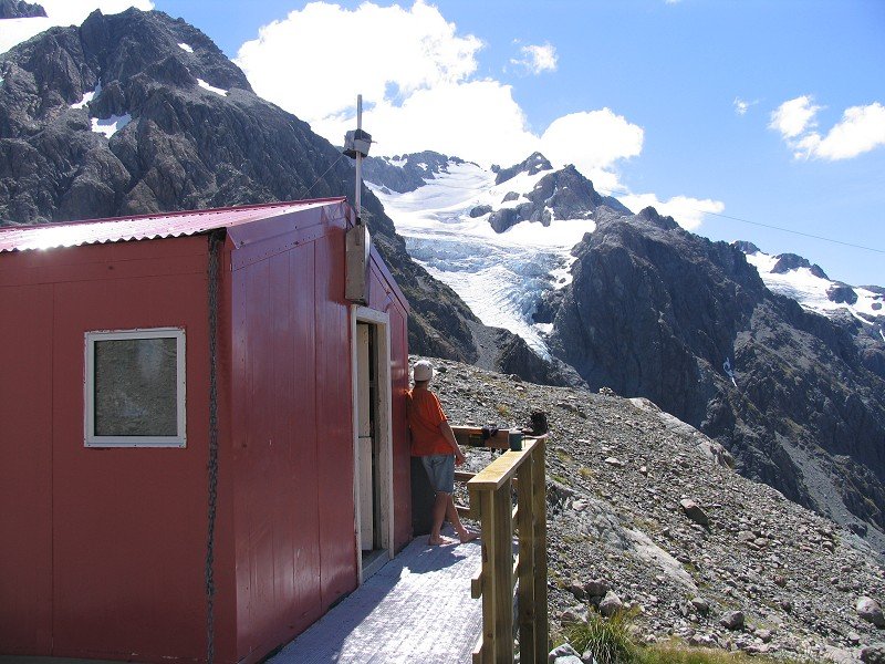 Once at the river it should be possible to find a place where you can leap the river on large boulders. Once on the true-right, cairns of rocks lead in nearly every conceivable direction, pick one, and follow it through a moraine boulder field on the terrace, all routes lead to a steep rock gully through the bluffs above. Climb up the gully following rock cairns, the hut toilet will come into view first, then the hut perched on its moraine spur.