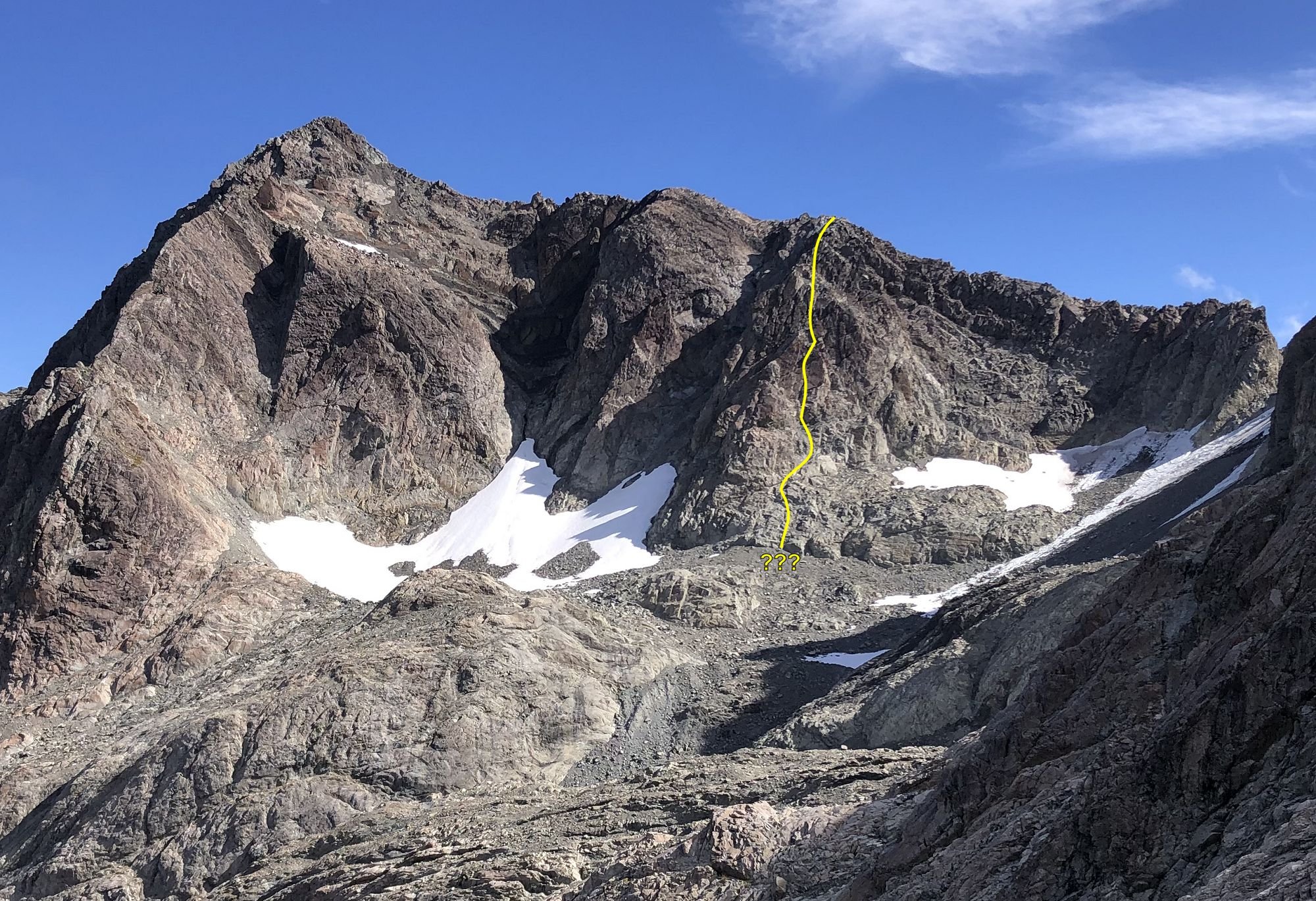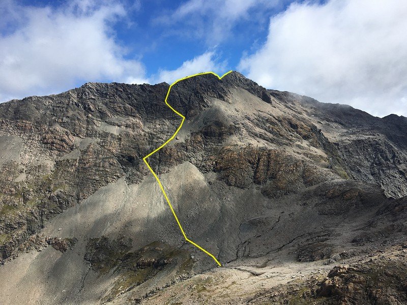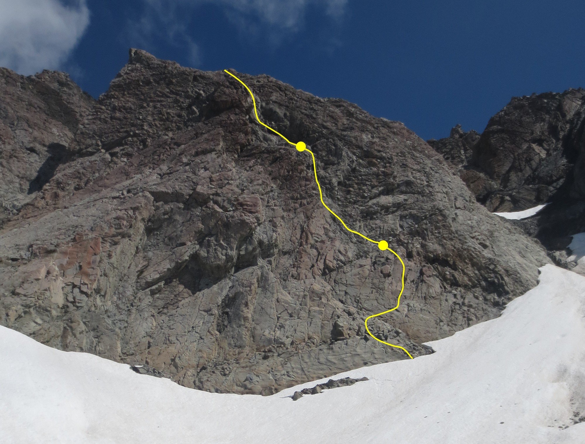 Gain the southwest spur at it's toe or at half-height using snow/scree slopes and easy scrambling on the right. Above half-height is a fantastic defined rib with easy climbing but terrific exposure. The final section of the spur steepens, with a couple of 5m vertical steps that can be climbed in one 60m pitch. From the top of the pitch it's 30-40m scramble to the summit. Overall the rock quality is good, apart from a couple of loose sections during and above the top pitch. A confident party could solo until the final pitch but simul-climbing until the final steep section suits the lower route.