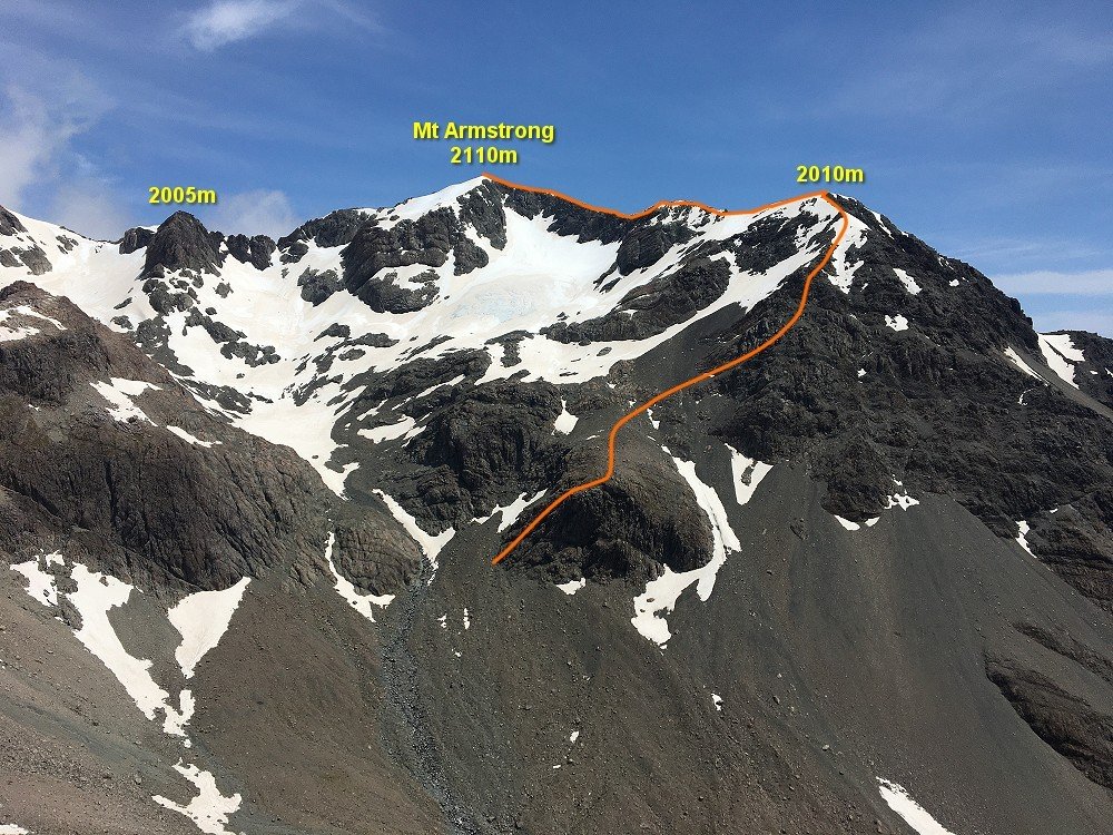 From the head of the Rolleston River sidle north across the scree slopes on the true-left of the river to access the east face of Mt Armstrong. Towards the northeast corner of the face a large rock toe protrudes onto the scree and can be used as a starting point to climb up the face towards point 2010m directly above. The 500 metre long climb takes place on a mixture of good, solid rock and loose scree/rotten rock. Halfway up the face is a short but steep rock step that must be climbed. Once point 2010m is reached, follow the East Ridge all the way to the summit.
