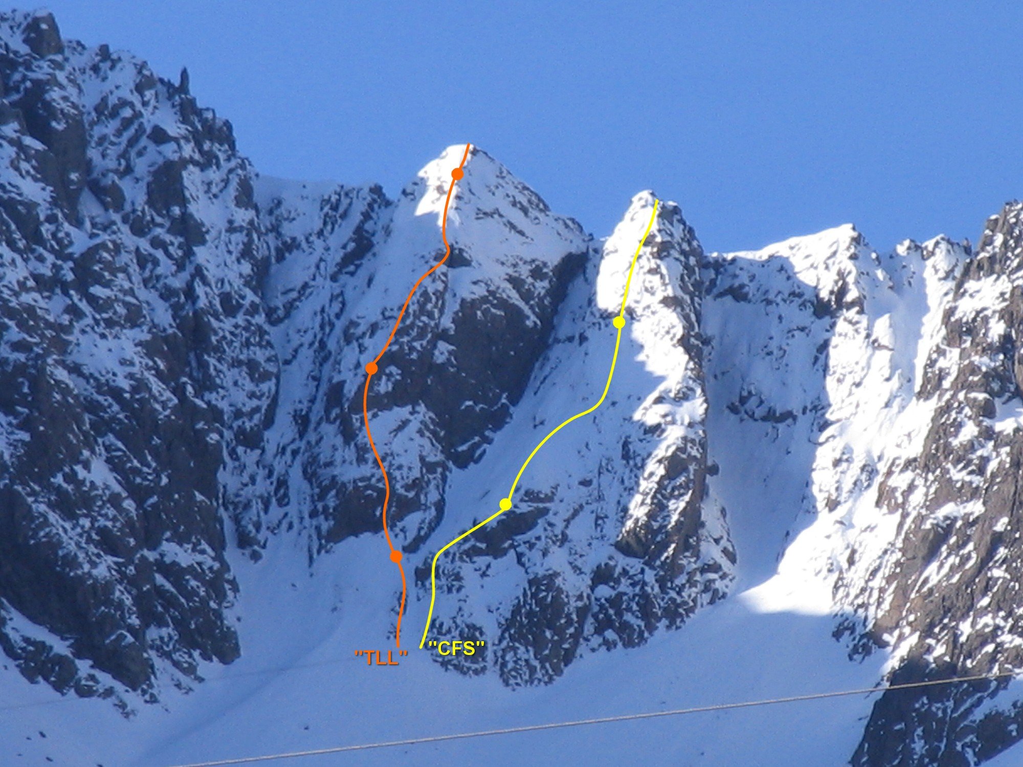 This route starts furthest to the right, adjacent to a massive rock buttress. Climb the ice gully through one pitch until below a head-wall of rock; traverse left over a rock rib on a final pitch to join easier ground above "Dos Duendes". Climb the bouldered ramp towards the summit. Descent is via the western gully.