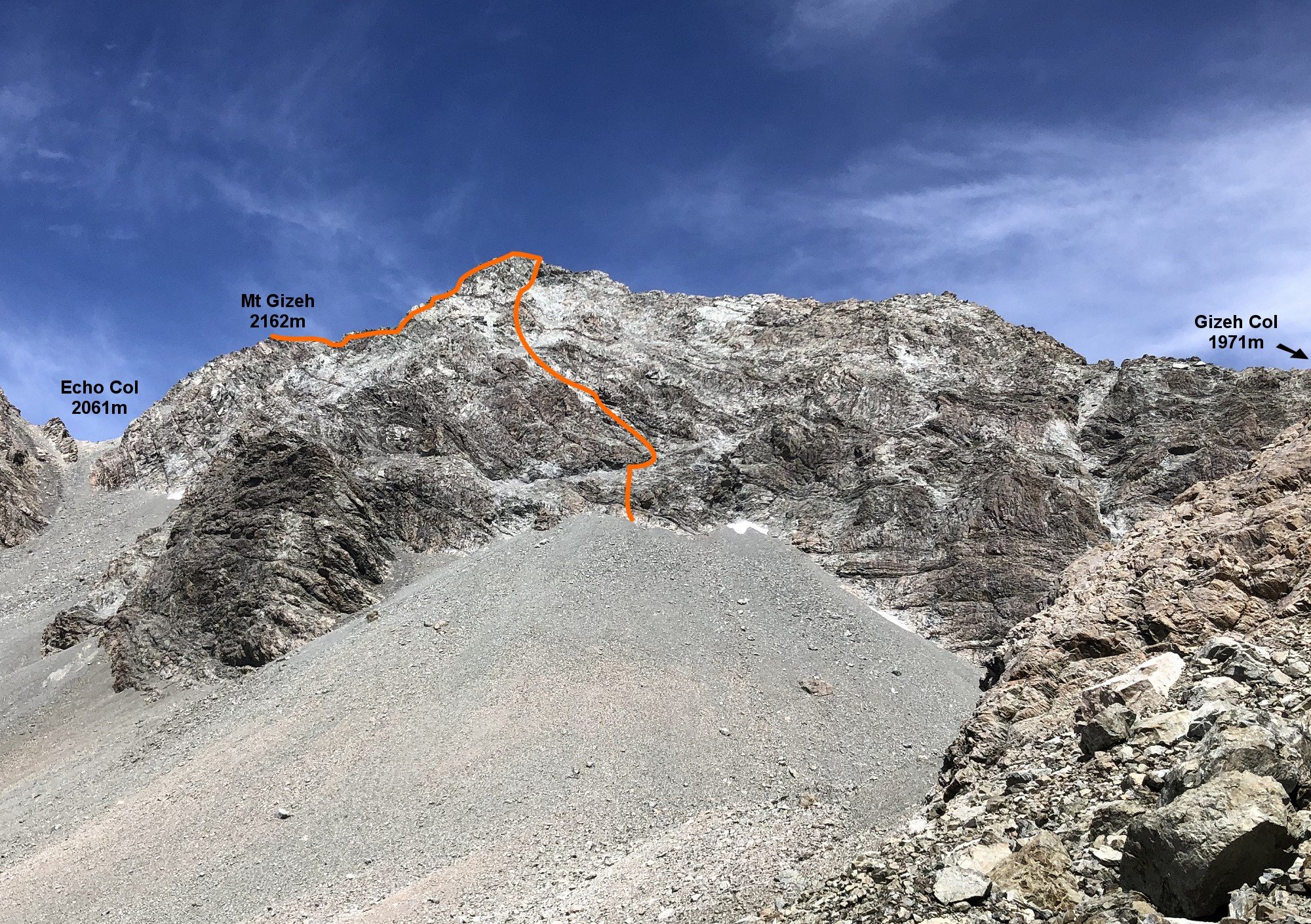 Access to the north-east face is easily gained via an obvious gully at the base of the face. From here follow a series of gullies and ledges, heading up diagonally to the climbers left, through very loose, shattered rock until you reach the summit ridge which can then can be traversed to the summit itself. Descend via Gizeh Col, or via the much steeper and looser Echo Col route.