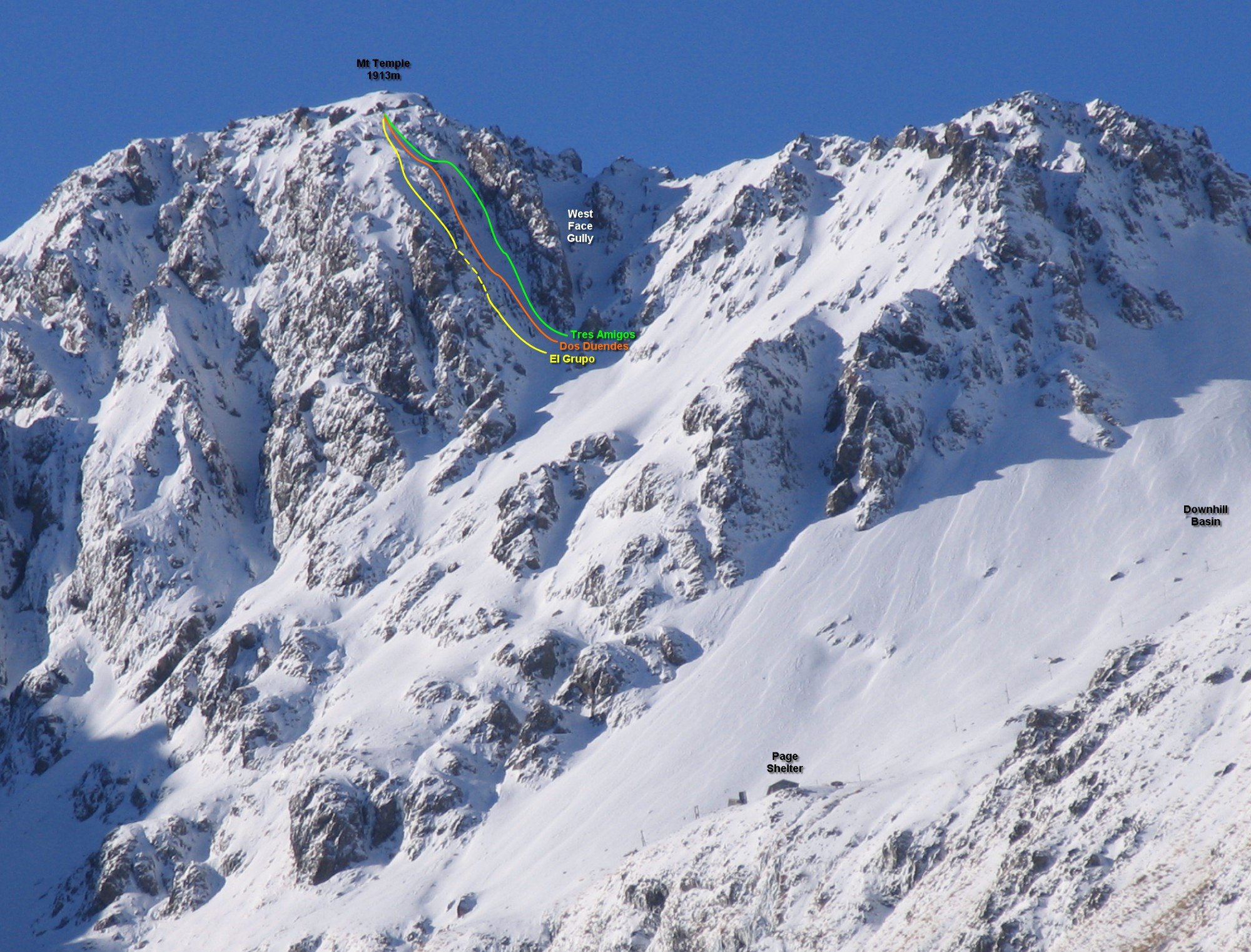 Winter routes only. The "Three Amigos" routes commence on the northern side of the West Face Gully route (normal descent route) where it begins to rise steeply.