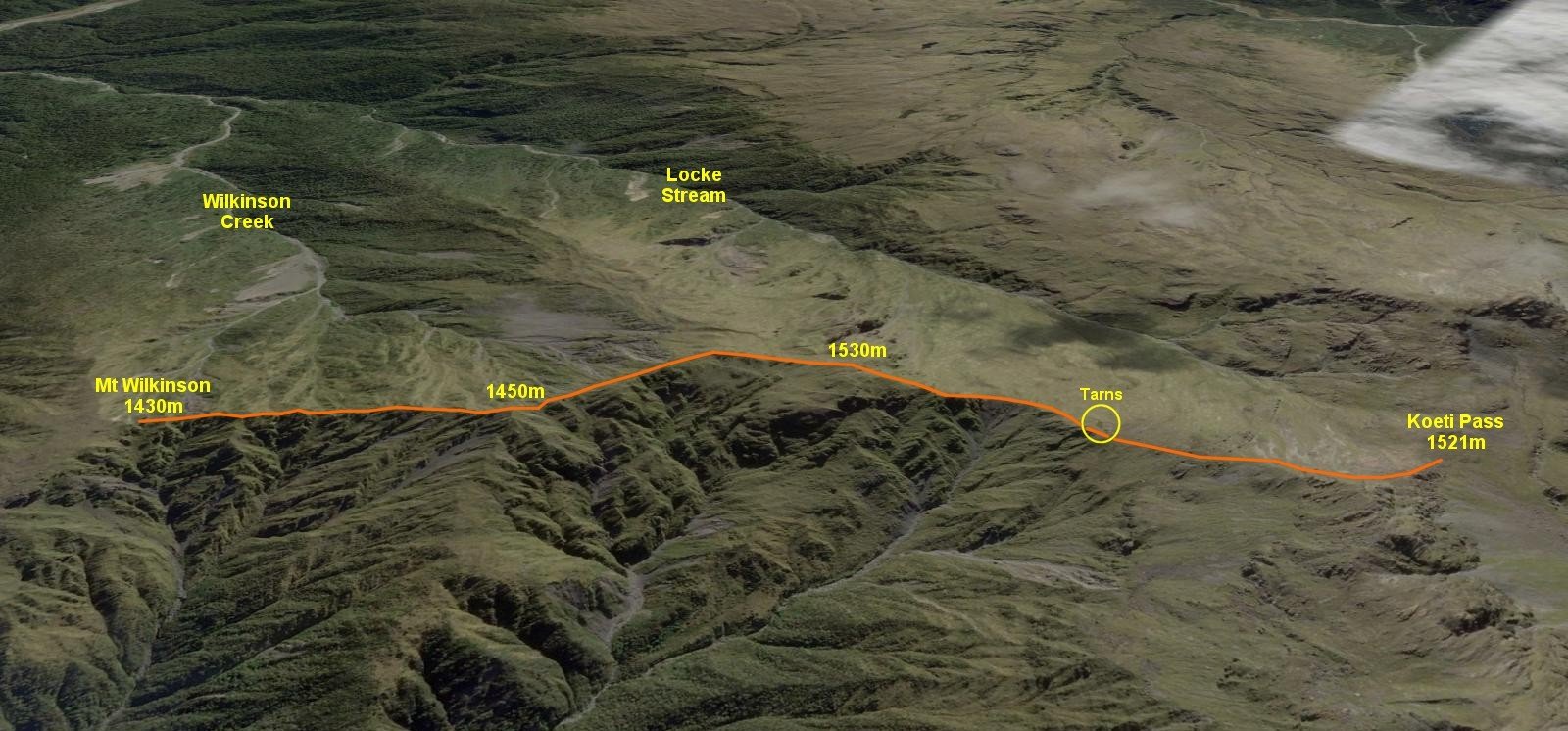 From Koeti Pass (1521m) travel is over easy ground, joining the ridge that climbs to the 1530m point. Water may be available from tiny tarns near the base of this ridge. From 1530m the ridge turns west descending to the 1450m point. From here the ridge narrows and steepens as it initially descends 100m before climbing again; a series of rock pinnacles can be bypassed on the Townsend Creek side via steep snow-grass, slips, and tussock. Ice-axe & crampons are recommended for any snow covered ascent as the terrain in this area is steep.