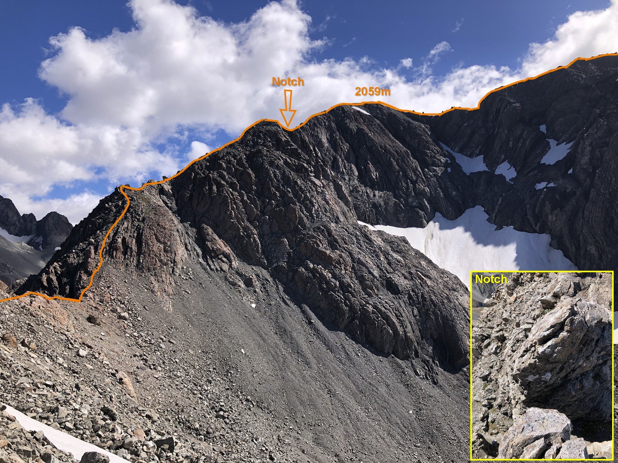 Notes: Avalanches sweep the Whitehorn Pass and ice-field area in Winter/Spring. The notch on the ridge is very difficult to climb through, consider your options, and don't fall!