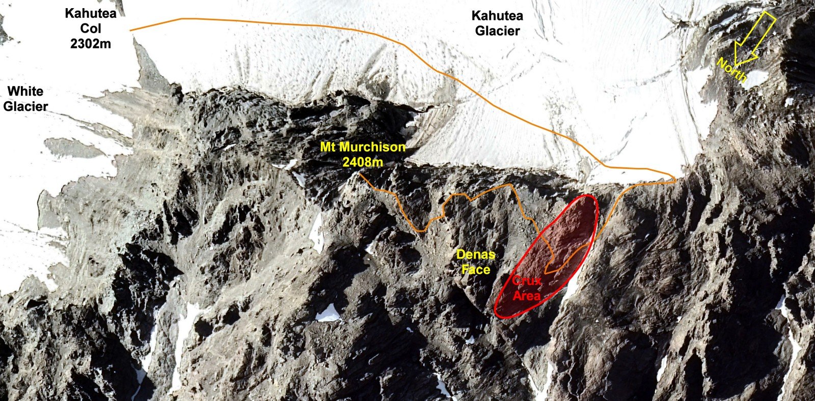 In early 2022 Mt Murchison's northeast ridge collapsed onto the neve of the White Glacier. This has created very large and unstable moraine piles on the glacial surface. As the glacier is barely moving these days, being captive in it's rock basin, this debris field is not expected to disperse any time soon. Climbers should now move towards the centre of the glacier to avoid the rockpiles enroute to Kahutea Col.