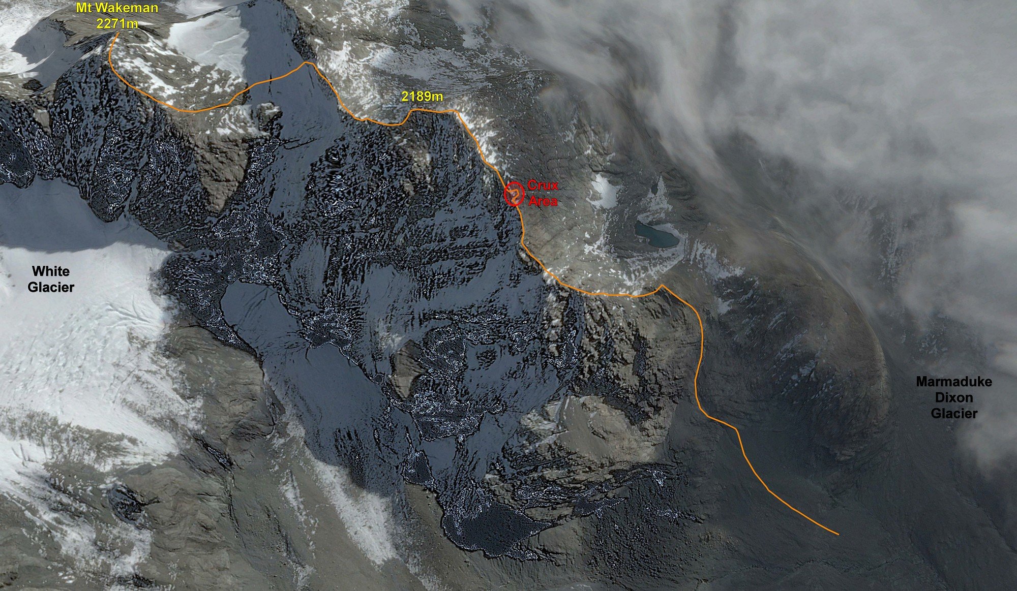 The section of ridge below the 2189m point is extremely narrow (only space for feet and hands) with considerable exposure on both sides. Several rotten pinnacles are met on this section of ridge, most can be climbed over, however the final pinnacle is not climbable. The solution is to drop down onto the north face of the ridge, sidling underneath the pinnacle via a network of crumbly catwalks/ledges and reascending 15m vertically back to the ridge; this is the most exposed part of the route. Continue scrambling to the 2189m point, following the ridge to join the standard Marmaduke Dixon Glacier route at a steep gully (usually ice) descending onto the ice-field north of the summit. Cross the ice-field, climbing onto the steep, loose northeast spur that ascends to the summit rocks.