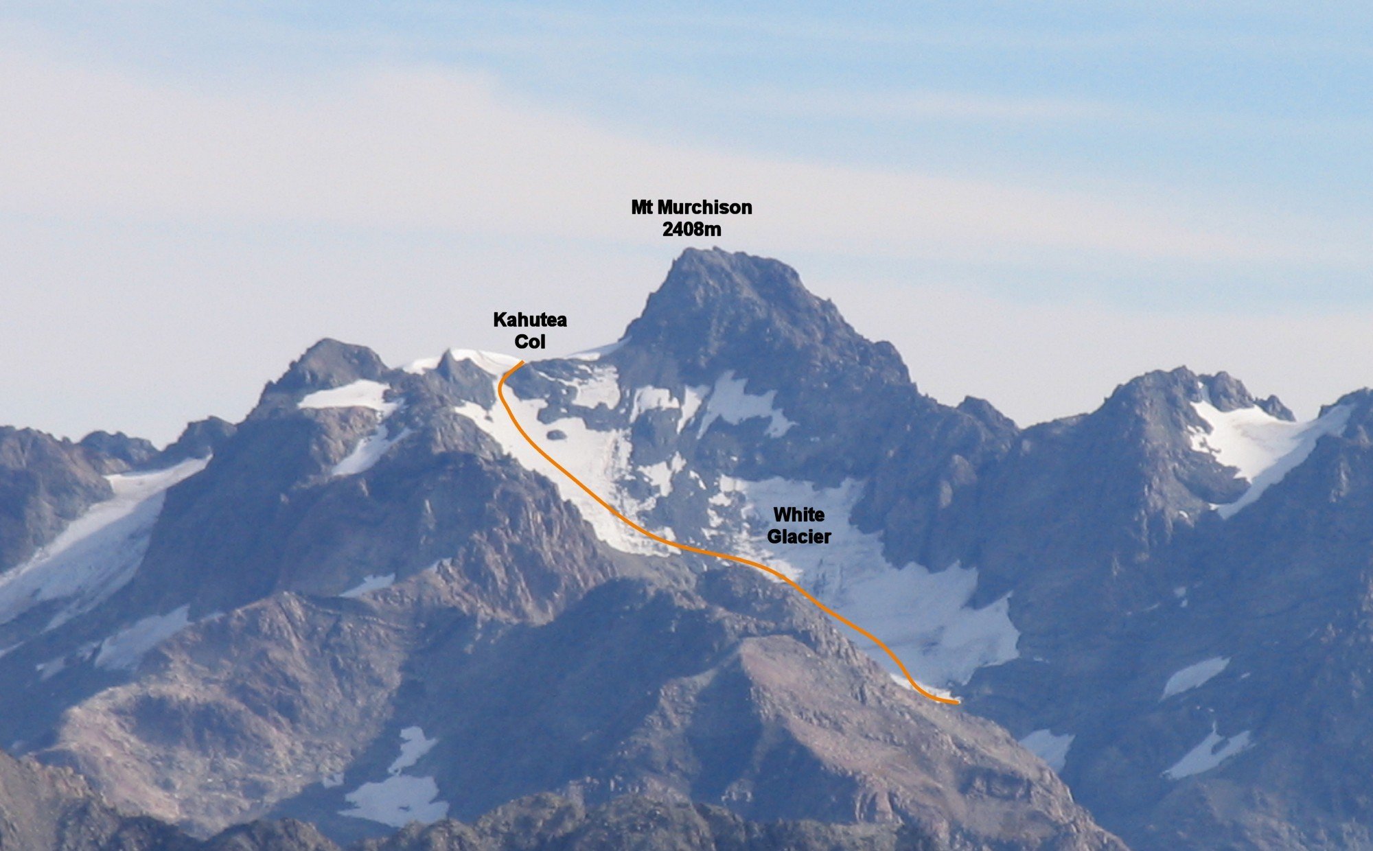 From Kahutea Col sidle the ice slopes of the Kahutea Glacier névé under Mt Murchison southwest for about 350m. This enters into a large bay of steep ice between rocky spurs. Ascend 60m to the top left-hand corner to gain the southwest ridge of Mt Murchison via a short, loose rock step. This route would likely be cut-off by bergschrunds in late summer.