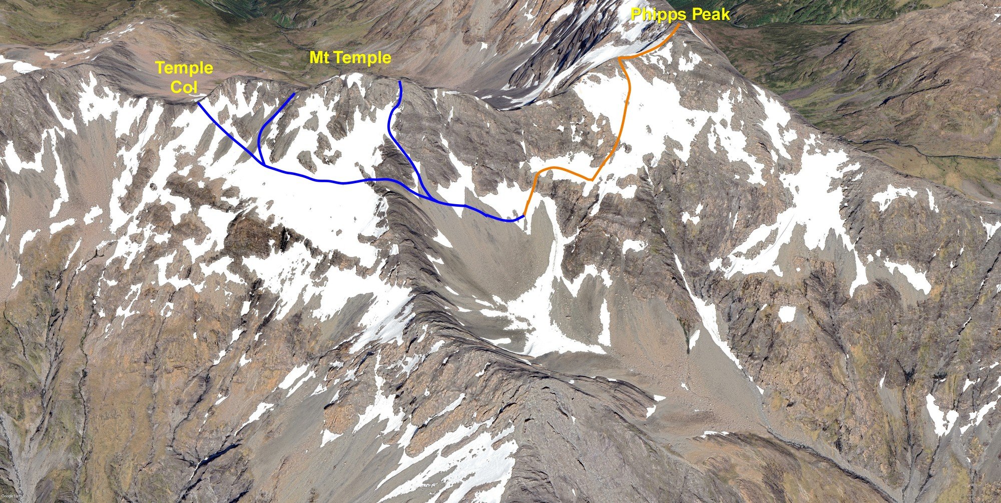Sidle talus slopes under Mt Temple northwards, then ascend onto the East Face of Phipps Peak, northward up through two bands of straightforward bluffs climbing about 100m. At about 1800m, ascend west up through more talus slopes. The third bluff band (crux) is met at about 1860m which leads up onto the South Ridge of Phipps (a.k.a. Temple traverse), just below the summit rocks.