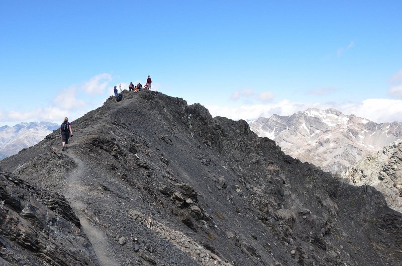 Scotts Track connects up with the Avalanche Peak track (yellow markers) just below the summit. The final ridge is a razor-blade with cliffs on either side, only venture out here if confident of heights, and the wind-speeds are low. The round trip is possible, but only in fine weather and good track conditions.
