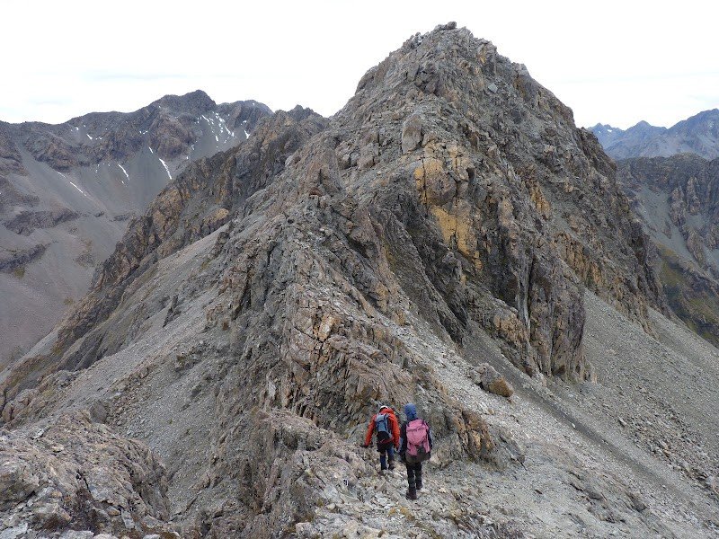 From here, the ridge narrows and becomes quite loose as it circles the Punchbowl Creek valley. There are many gendarmes, each having its own bypass technique, whether that be narrow cat-walks, scree gullies, or simply rock-climbing over them. Descent can be tricky on many, hence the handline and a partner comes in handy.
