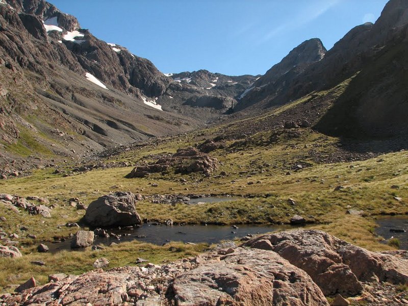 Eventually the route breaks tree-line into alpine scrub and tussock about 700m before you reach the Campbell Creek confluence. The route can be quite vague here, but basically follows beside, or on the river edge. After Campbell Creek the route follows the river flats for about 1km before it begins to pass under the massive bluffs under Carrington Peak. It is recommended to cross the Waimakariri River here to its true-left to avoid potential rockfall from the bluffs. Continue following the river upstream for about 700m to a large bouldery scree slope, and cross back to the true-right.