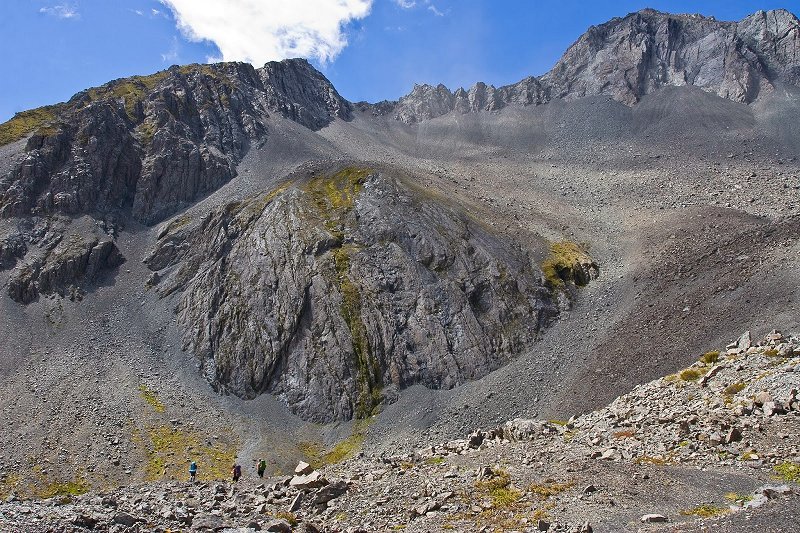 Climb onto the rockpile and follow the numerous rock cairns across the debris field to the base of Tarn Col where you will encounter a sign. A pole-marked route ascends onto a very steep rock spur to Tarn Col, a climb of just over 100 metres vertically over 800 metres.