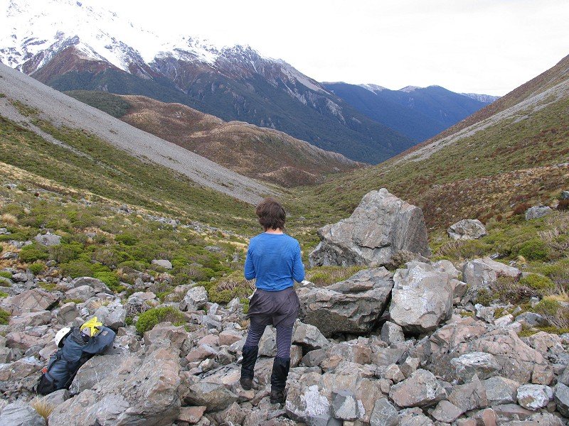 Follow the pole-marked route from the hut upstream. The route shortly drops into the riverbed. Travel is generally beside the river, crossing back and forth where necessary. Keep your eye our for Blue Duck (Whio) in the river. Above the confluence of the unnamed Amber Col stream the river can be dry in the summer months. The rockpiles of Taruahuna Pass are reached in about 2 hours from the hut.